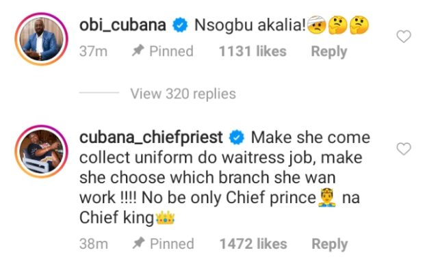 “Nsogbu akalia”, Obi Cubana wrote. Cubana Chiefpriest on his own part, advised the lady to come and collect uniform to do waitress job.