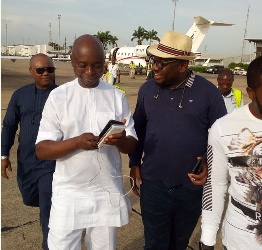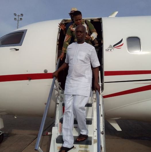 He flew to his home state in company of his cute daughters and some of his political aides, members of Coalition of Nigeria Entertainers, media team and Young Enterpreneurs.