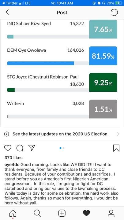 Good morning. Looks like WE DID IT!!! I want to thank everyone, from family and close friends to DC residents. Because of your contributions and sacrifices, I stand before you as America’s first Nigerian American congressman. In this role, I’m going to fight for DC statehood and bring our values to the lawmaking process. While today is day for some celebration, the hard work also follows. Again, thanks so much for everything. I wouldnt be here without yall.