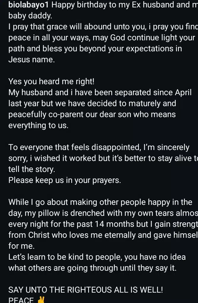 In a recent Instagram post, Biola Adebayo shared that they parted ways in April 2024 and decided to co-parent their son peacefully.