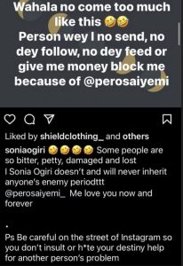 “Wahala no come too much like this. Person wey I no send, no dey follow, no dey feed or give me money block me because of @perosaiyemi,” she wrote in an Instagram post.