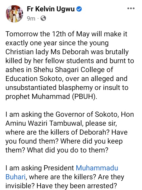 “Tomorrow the 12th of May will make it exactly one year since the young Christian lady Ms Deborah was brutally killed by her fellow students and burnt to ashes in Shehu Shagari College of Education Sokoto, over an alleged and unsubstantiated blasphemy or insult to prophet Muhammad (PBUH),” he wrote.