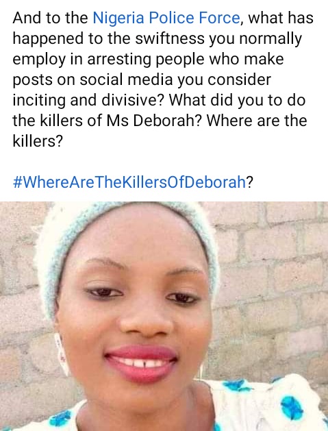 “And to the Nigeria Police Force, what has happened to the swiftness you normally employ in arresting people who make posts on social media you consider inciting and divisive? What did you to do the killers of Ms. Deborah? Where are the killers?”