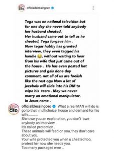 Reacting to his interview, Blessing described him as an ”emotional manipulator”. According to Blessing, if Ajeboh truly loves his wife, he would hear from Tega first before granting any interview.