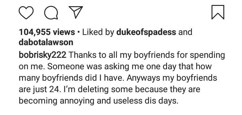 He wrote: “Thanks to all my boyfriends for spending on me. Someone was asking me one day that how many boyfriends did I have. Anyways my boyfriends are just 24. I’m deleting some because they are becoming annoying and useless dis days.”