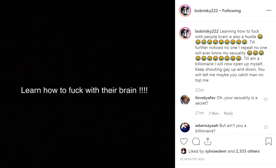 The more people keep showing interest to know about your SEXUALITY as if it’s their business the more I keep fucking their brain up. Just imagine someone saying Bobrisky now has breast and hips. The question is “WAS HE THERE WITH ME WHEN I WAS FIXING THE BREAST. Nigeria ?? my country. Your assignment is keep guessing till I decide to open up myself” he wrote