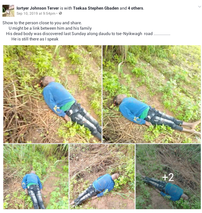 “Show to the person close to you and share. U might be a link between him and his family.His dead body was discovered last Sunday along daudu to tse-Nyikwagh road He is still there as I speak” said