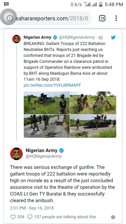 “There was serious exchange of gunfire. The gallant troops of 222 battalion were reportedly high on morale as a result of the just concluded assurance visit to the theatre of operation by the COAS Lt Gen TY Buratai & they successfully cleared the ambush.