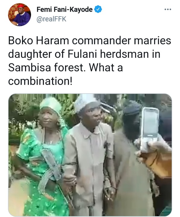 Boko Haram commander gets married to the daughter of a Fulani herdsman in Sambisa forest, and the video was shared by Femi Fani Kayode via Twitter, IgbereTV reports.