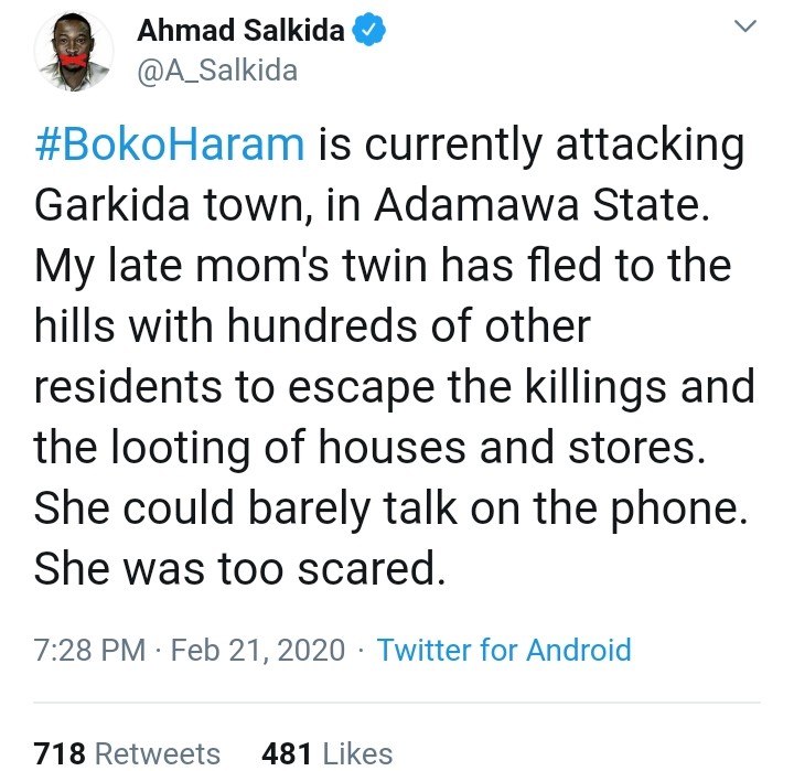 BokoHaram is currently attacking Garkida town, in Adamawa State. My late mom’s twin has fled to the hills with hundreds of other residents to escape the killings and the looting of houses and stores. She could barely talk on the phone. She was too scared.