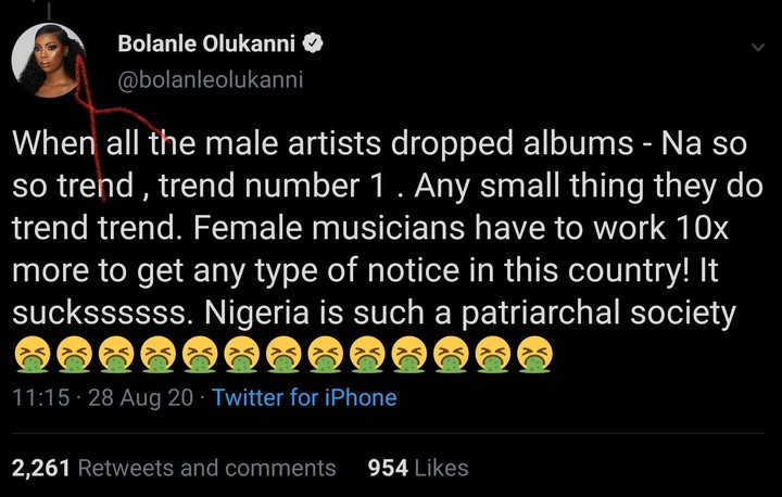 Female musicians have to work 10x more to get any type of notice in this country! It suckssssss. Nigeria is such a patriarchal society.