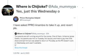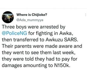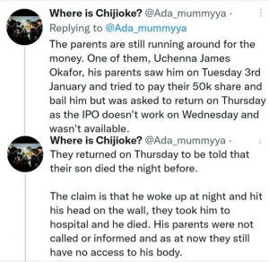 According to the Twitter user, Uchenna’s parents were asked to bring N150, 000 for the release of their son. Sadly, when they got there on Thursday, they were informed that their son had passed.