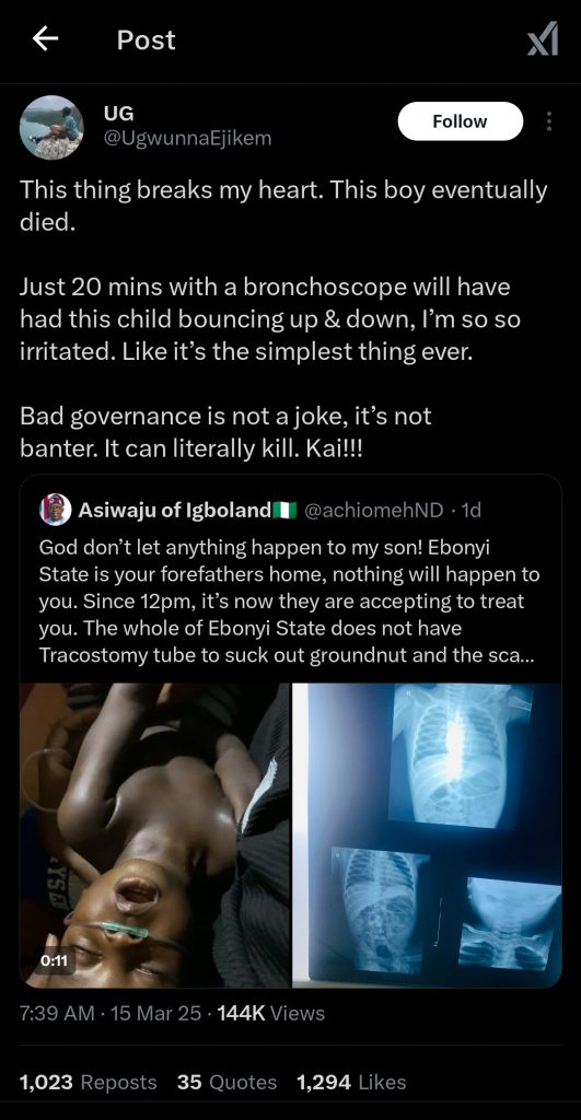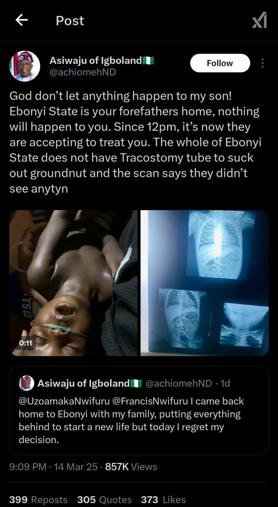 In a post on X, formerly Twitter, the man recounted how he desperately went from hospital to hospital in Abakaliki, seeking a scan to determine what was obstructing his son’s breathing.