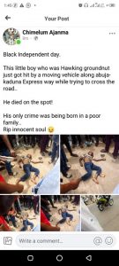 Self acclaimed Human right activist and influencer,Chimelum Ajanma has taken to his facebook page to share how a little street hawker got hit by a vehicle and died on the spot.