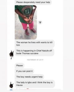 Reports about the abuse were shared online and human rights activist went to the given address in Surulere. There, they met the boy and his madam.