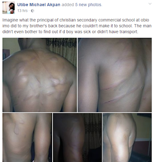 Imagine what the principal of christian secondary commercial school at obio imo did to my brother’s back because he couldn’t make it to school. The man didn’t even bother to find out if d boy was sick or didn’t have transport.