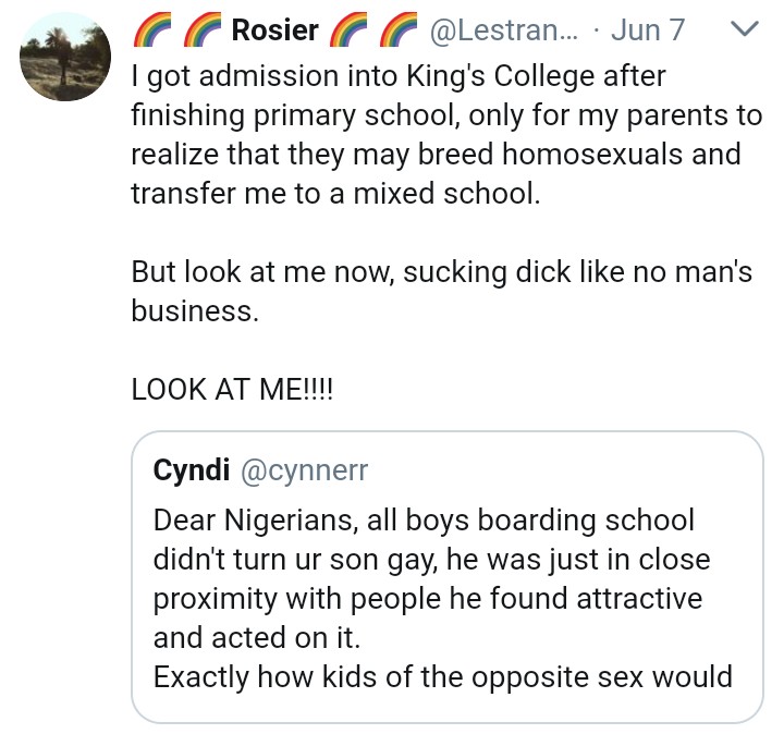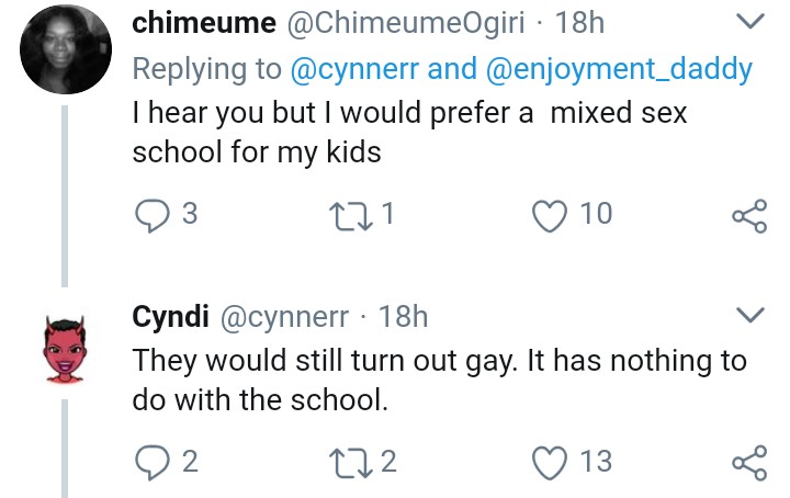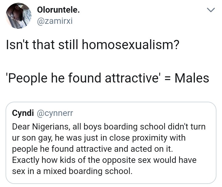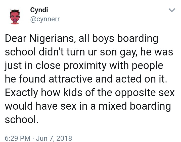 A Nigerian lady on Twitter, Cyndi is of the opinion that male boarding schools do not play a role in turning a young boy gay as most of them already had tendencies which was heightened after close proximity with other boys.