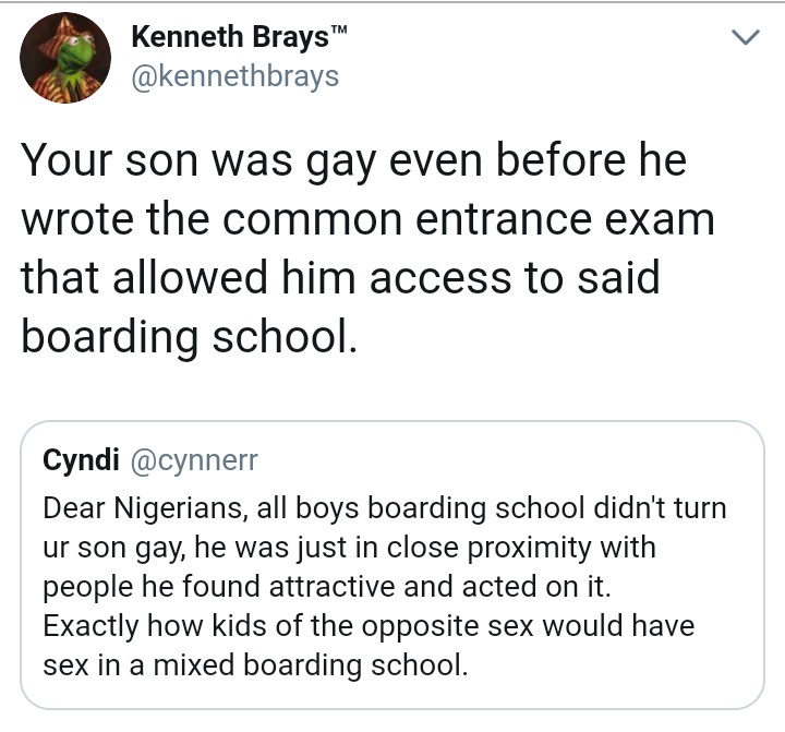The Tweets were supported by a Nigerian man who says his parents transfered him from an all boys school to a mixed school for fear of breeding a homosexual, but this didn’t have any impact on him as he turned gay eventually.