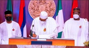 The President signed the documents in the Presidential Villa in the presence of Senate President Ahmed Lawan, Speaker of the House of Representatives, Femi Gbajabiamila, and other members of the Federal Executive Council.