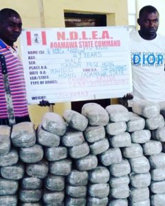 “In the same vein, NDLEA officers have arrested two drug dealers: Sani Isa (aka Bilaz) and Bala Yerima in Hong, Adamawa state with 239 blocks of cannabis sativa weighing 209kg, just as operatives of the Bauchi state Command have intercepted a truck marked FFF 422 XB coming from Lagos to Maiduguri, at Azare, Bauchi. A total of 164.8kg of cannabis sativa concealed in peak milk cartons was recovered from the truck.
