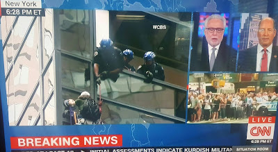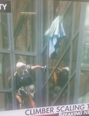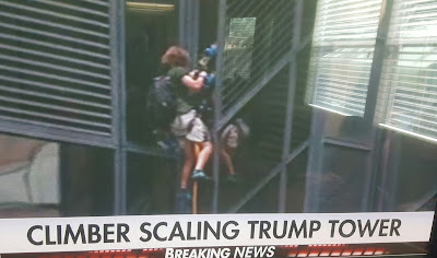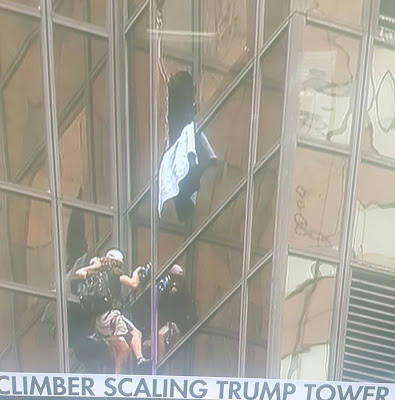 A man has been climbing the Trump Tower with large suction cups for about an hour and half but nobody knows why. He started climbing the tower from the 5th floor, now he is on the 16th floor. The Police have been trying to negotiate with him but he just keeps ignoring them. They have a large air bag on the ground in case he falls. Traffic has been diverted from below where he is. Story developing..