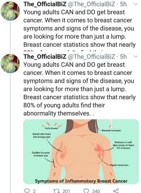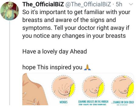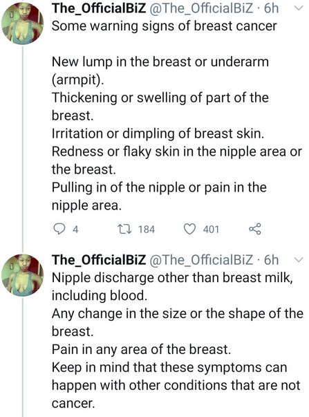 Identified by her Twitter handle, @theofficialbiz, the survivor advised women to check themselves regularly and she listed the “warning signs” they should look out for.