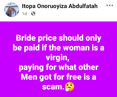 “Bride price should only be paid if the woman is a virgin, paying for what other Men got for free is a scam,” he wrote.