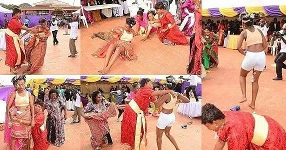 Photos have emerged on social media showing the shocking moments a young woman in the Masaka area of Uganda, was brutally attacked by ‘evil ghosts’ on her traditional wedding day and she undressed herself to the surprise of guests.
