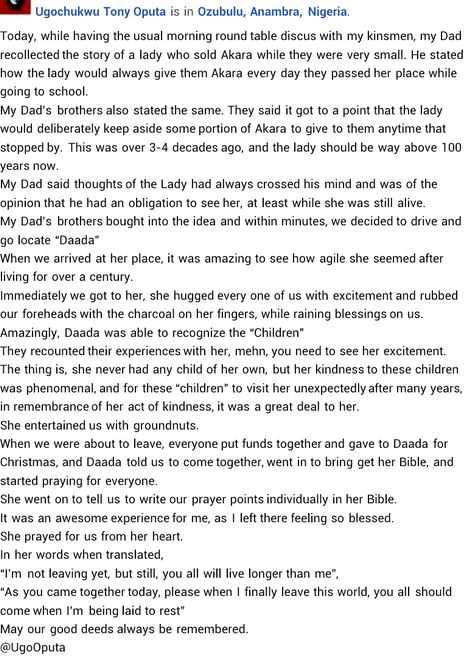 A Nigerian man identified as Ugochukwu Tony Oputa from Ozubulu, Anambra State on Sunday, took to Facebook to share a story of how his father and uncles reunited with an Akara seller, who used to give them Akara for free on their way to school decades ago.