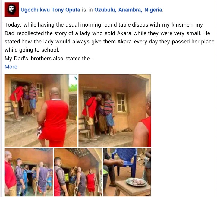 A Nigerian man, Ugochukwu Tony Oputa from Ozubulu, Anambra State on Sunday, shared a heartwarming story of his father and uncles’ reunion with a generous Akara seller, who used to give them akara balls everyday on their way to school forty years ago, IgbereTV reports.