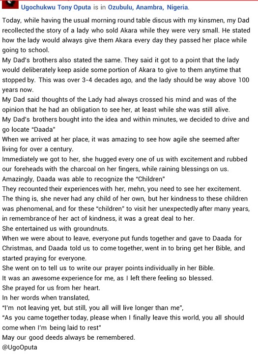 The thing is, she never had any child of her own, but her kindness to these children was phenomenal, and for these “children” to visit her unexpectedly after many years, in remembrance of her act of kindness, it was a great deal to her.