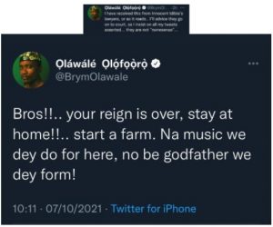 Reacting via his Twitter handle, Brymo wrote; ”I have received this from Innocent Idibia’s lawyers, or so it reads.. I’ll advice they go on to court, as I insist on all my tweets asserted… they are not “nonesense…Bros!!.. your reign is over, stay at home!!.. start a farm. Na music we dey do for here, no be godfather we dey form!”