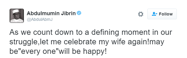 Former Chairman of the House of Representatives Committee on Appropriations, Abdulmumin Jibrin, shared this along with a photo of himself and his wife, via his twitter page. See the photo and another tweet after the cut.