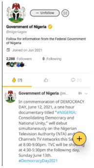 The Nigerian Government’s verified account on Koo with the name ‘Government of Nigeria’ @nigeriagov, has 6,000 followers at the moment.