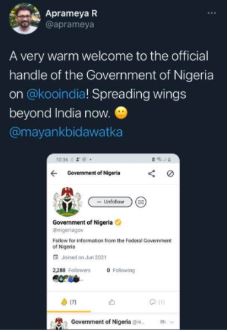 Koo co-founder and CEO, Aprameya Radhakrishna in a post shared on his Twitter account @aprameya, confirmed Nigerian government’s presence on Koo.
