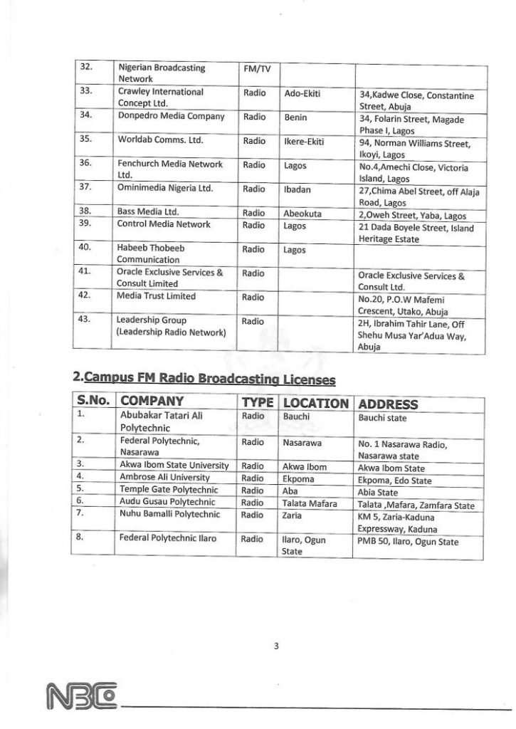 The statement read: “consequent upon the approval by the President, Federal Republic of Nigeria, President Muhammadu Buhari, the National Broadcasting Commission, NBC, has released the list of 65 successful companies and institutions of higher learning recently granted Radio and Digital Terrestrial Television licenses.