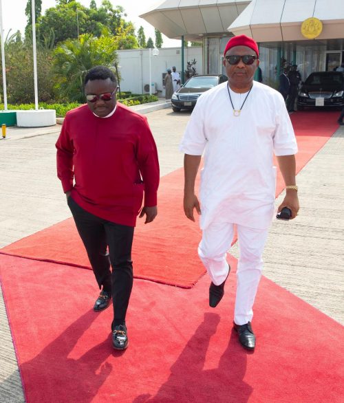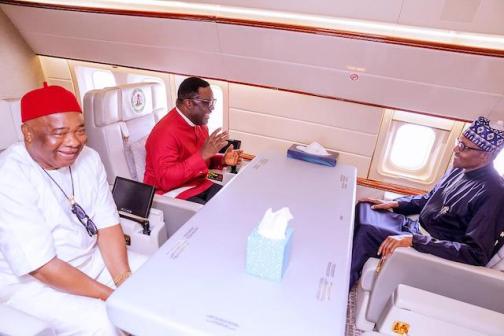 In his entourage are Professor Ben Ayade and Hope Uzodinma, governors of Cross River and Imo respectively.