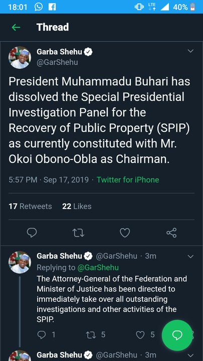 The Attorney-General of the Federation and Minister of Justice has been directed to immediately take over all outstanding investigations and other activities of the SPIP.