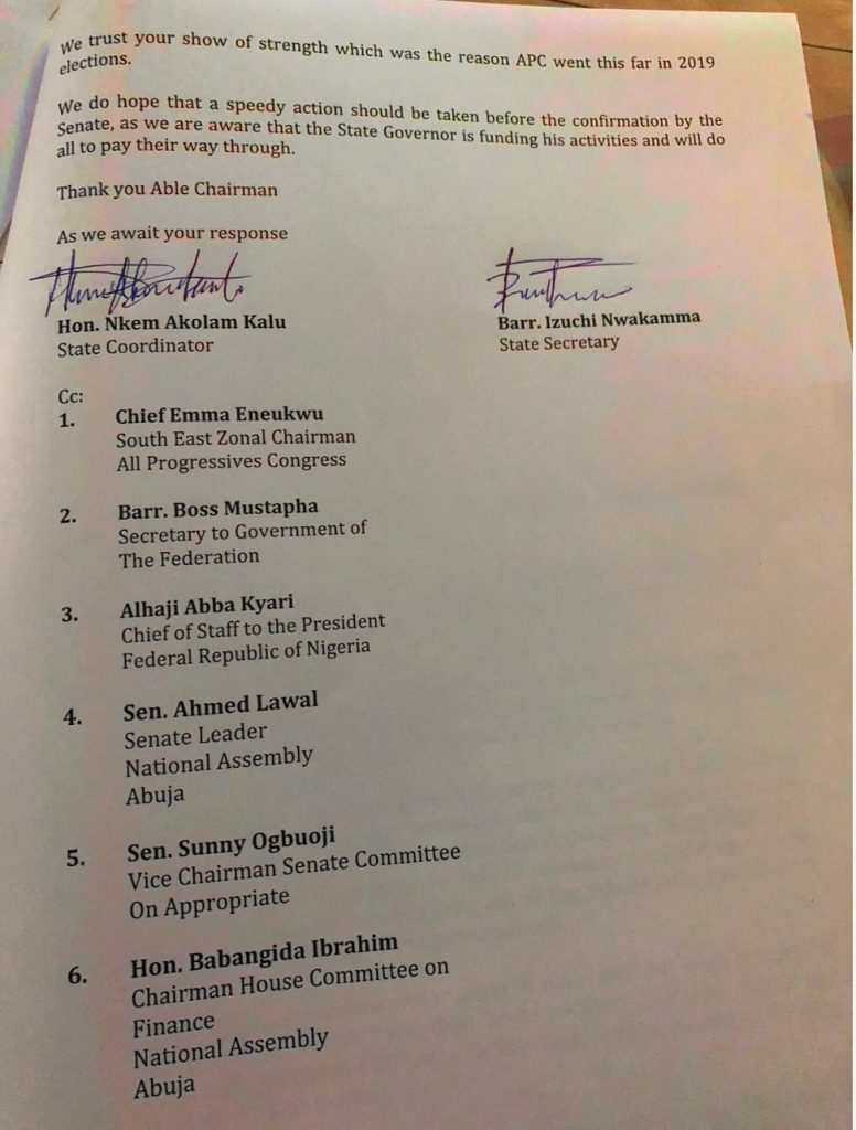 “3. That, per chance, you allow his name to go through for the confirmation in the National Assembly, you have sowed seed of discords within the Abia APC loyalists, who invested their time and resources in mobilizing Abians during the campaigns, hoping for a true change of government, but their dreams and hopes were shattered with the election outcome that was characterized with fraud, manipulations, sabotage and internal subversion.