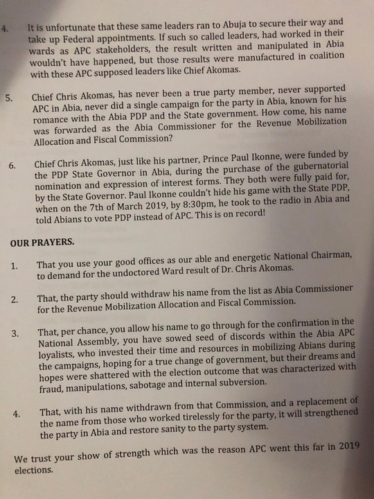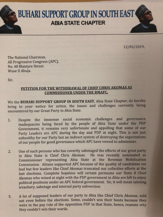 “2. One of such persons who has covertly sabotaged the efforts of our great party in Abia State is Chief Chris Akomas. He was recently nominated as Commissioner representing Abia State at the Revenue Mobilisation Commission. Abians supported APC because of the quality of candidates we had but few leaders like Chief Akomas truncated our collective efforts at the last elections. Complete hopeless will certain permeate our State if Chief Akomas who wined at night with the PDP government in Abia are left to enjoy political positions under an APC federal government. Sir, it will mean saluting treachery, sabotage and internal party subversion.