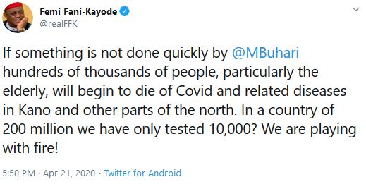 Critic, Femi Fani-Kayode has called on President Muhammadu Buhari to act fast or hundreds of thousands of people may begin to die in Kano over coronavirus.