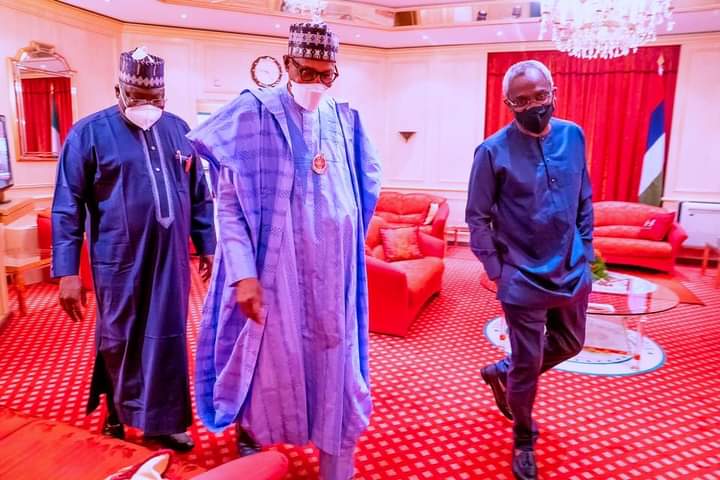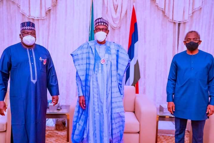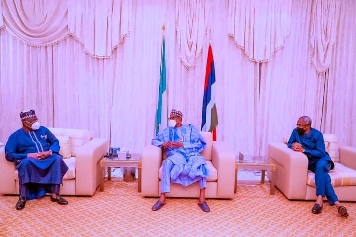 President Buhari receives in audience Senate President Ahmed Lawan and Speaker Femi Gbajabiamila in State House on 23rd Dec 2021