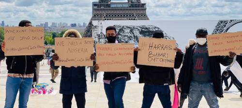 Some of the placards read, “Innocent Nigerians are dying daily”, “Buhari government has failed Nigerians” and “Harass Buhari out of Paris.”