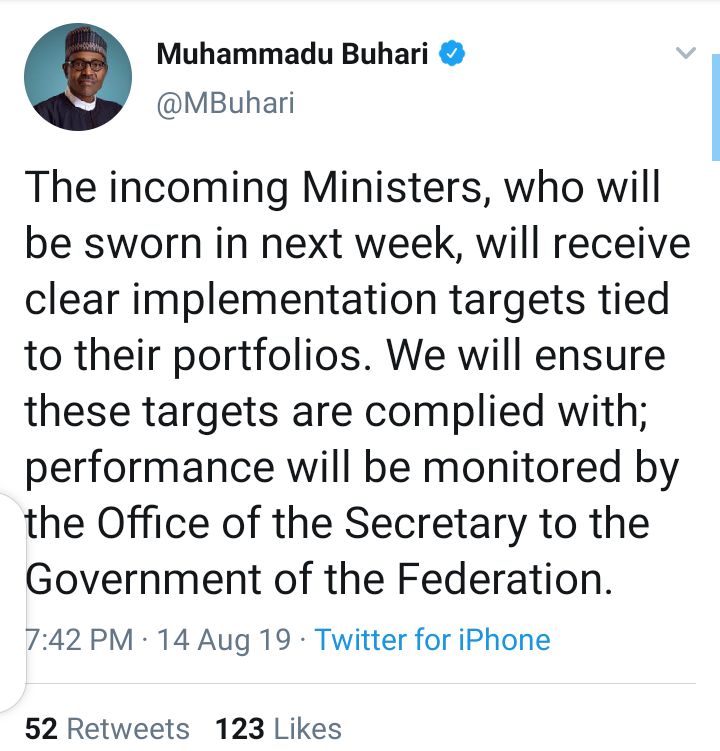 Disclosing the latest development via his verified Twitter handle, Buhari said such targets would be tied to each Minister’s portfolio.