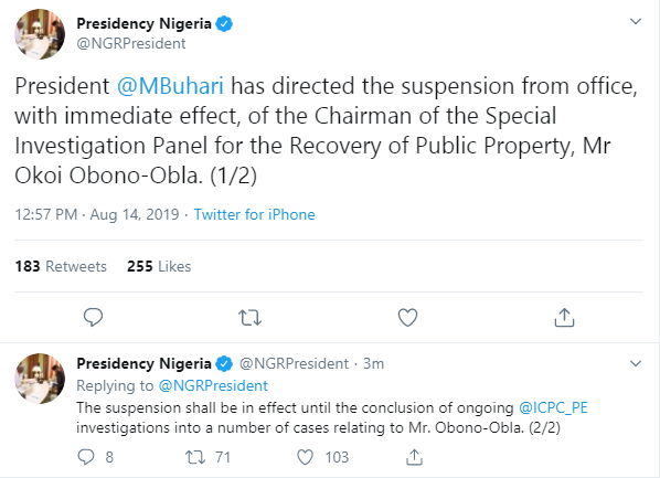 The suspension confirmed via the official Twitter handle of the Presidency will be in effect until the conclusion of ongoing investigations by the Independent Corrupt Practices Commission (ICPC).