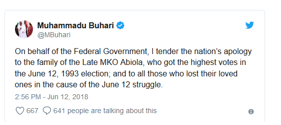 “I tender the nation’s apology to the family of MKO Abiola, Also to those who struggle and stood for June 12.”
