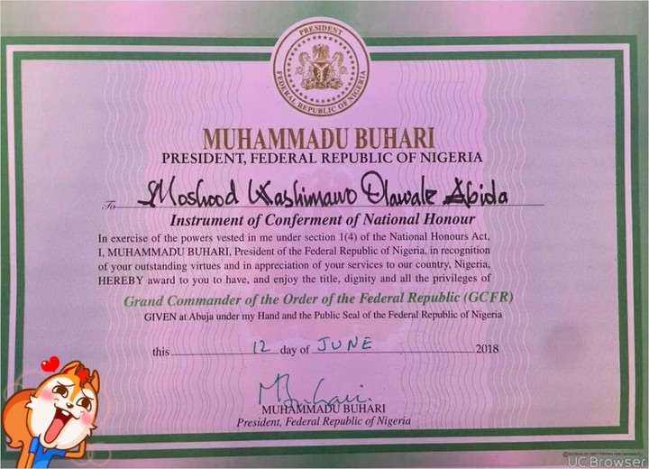Mr Kola Abiola and his sister Hafsat Biola spoke on behalf of the family of MKO Abiola, saluting Buhari for the honour done to the gladiators of June 12 and for honouring their father.