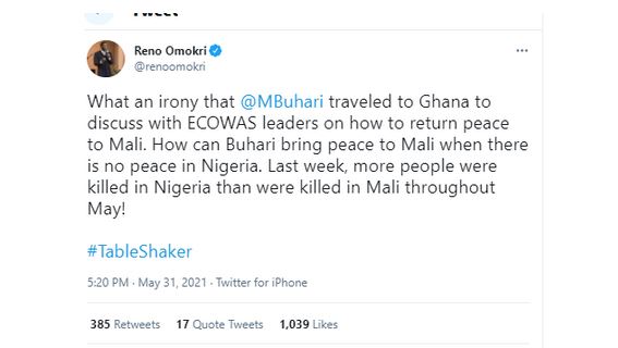 Reacting on Twitter, Reno wrote: “What an irony that @MBuhari traveled to Ghana to discuss with ECOWAS leaders on how to return peace to Mali. How can Buhari bring peace to Mali when there is no peace in Nigeria. Last week, more people were killed in Nigeria than were killed in Mali throughout May!”