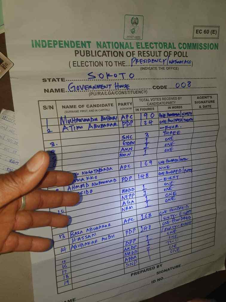 President Muhammdu Buhari of the All Progressives Congress (APC) has won at a polling unit inside the Sokoto Government House, and another at the Sultan’s palace in Sokoto metropolis.