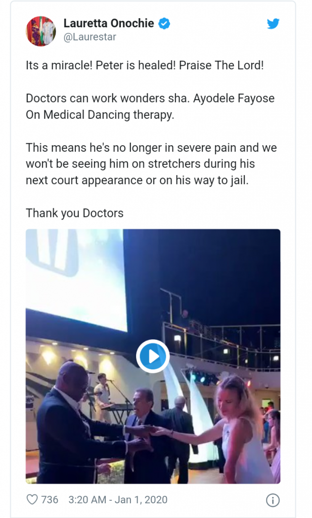 President Muhammadu Buhari’s Personal Assistant on Social Media, Lauretta Onochie has dragged the former governor of Ekiti state, Ayodele Fayose on Twitter insinuating that he feigned his sickness for which he was given bail to travel abroad on medical terms.